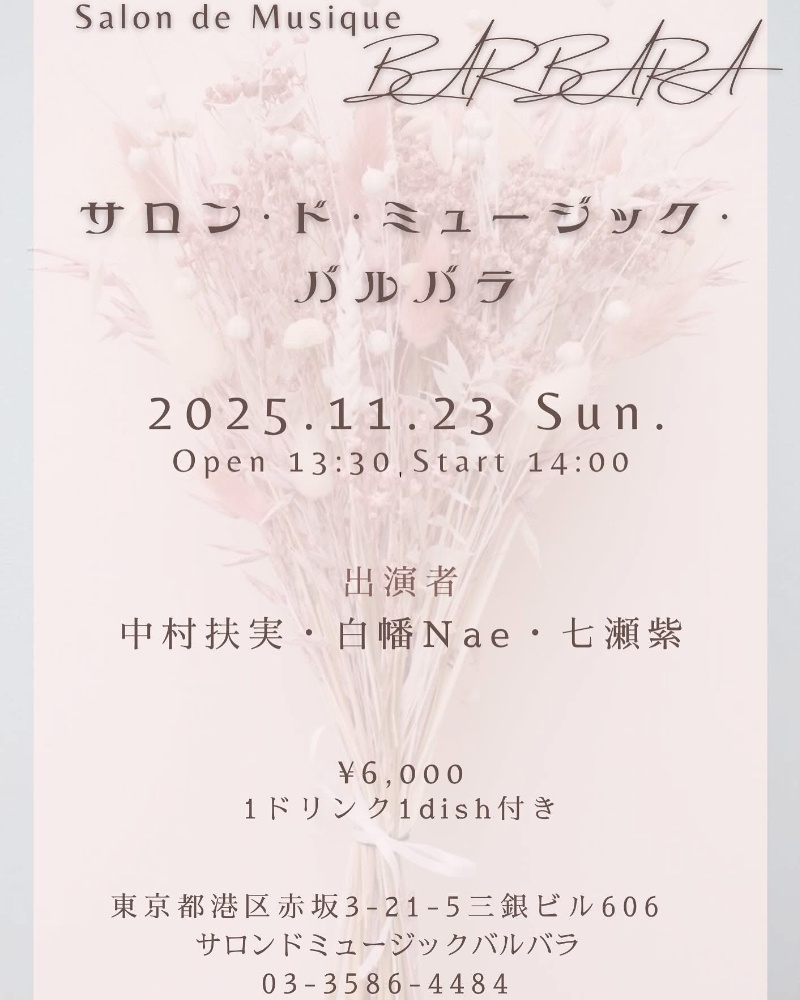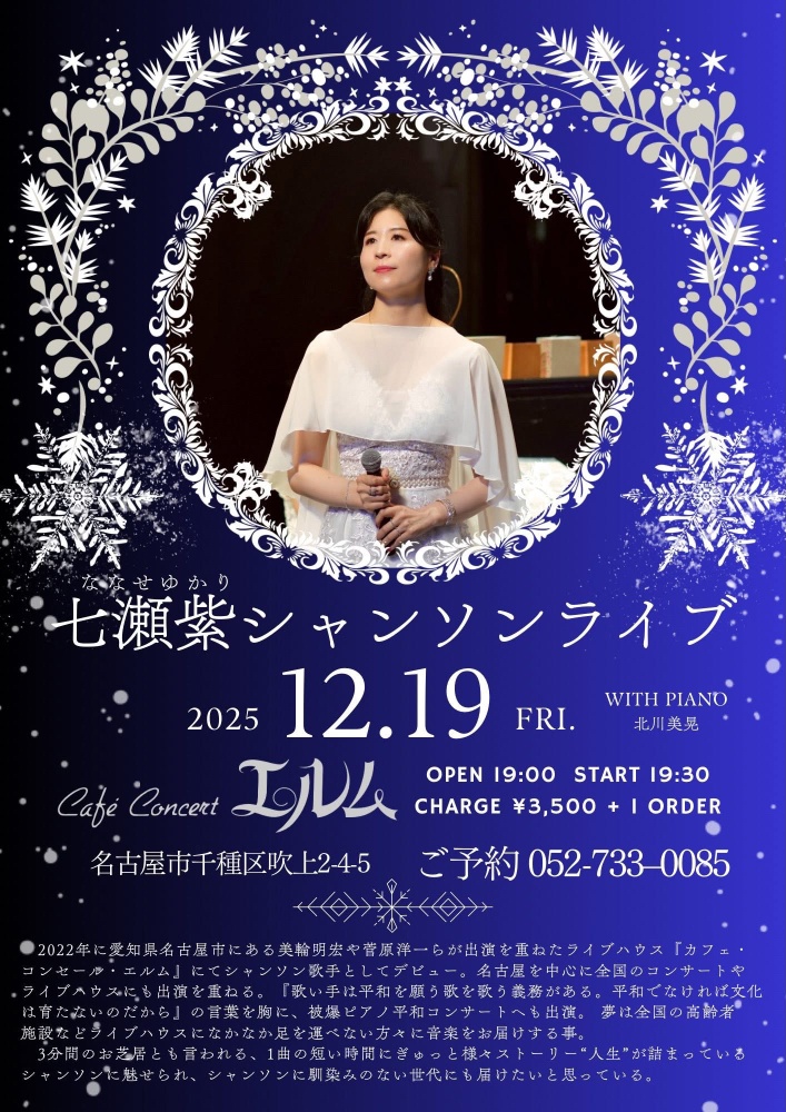 七瀬 紫 (ななせ ゆかり) 2022年に愛知県名古屋市にある 『カフェ・コンセール・工 ルム』にてシャンソン歌手としてデビュー。小学生と幼稚園 児の兄弟を育てながら名古屋を中心に活動する。夢は全国の 高齢者施設や福祉施設など、ライブハウスになかなか来られ ない方々に音楽をお届けする事。2023年には高齢者施設や 小学校でのボランティアステージを開催した。