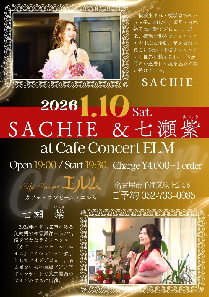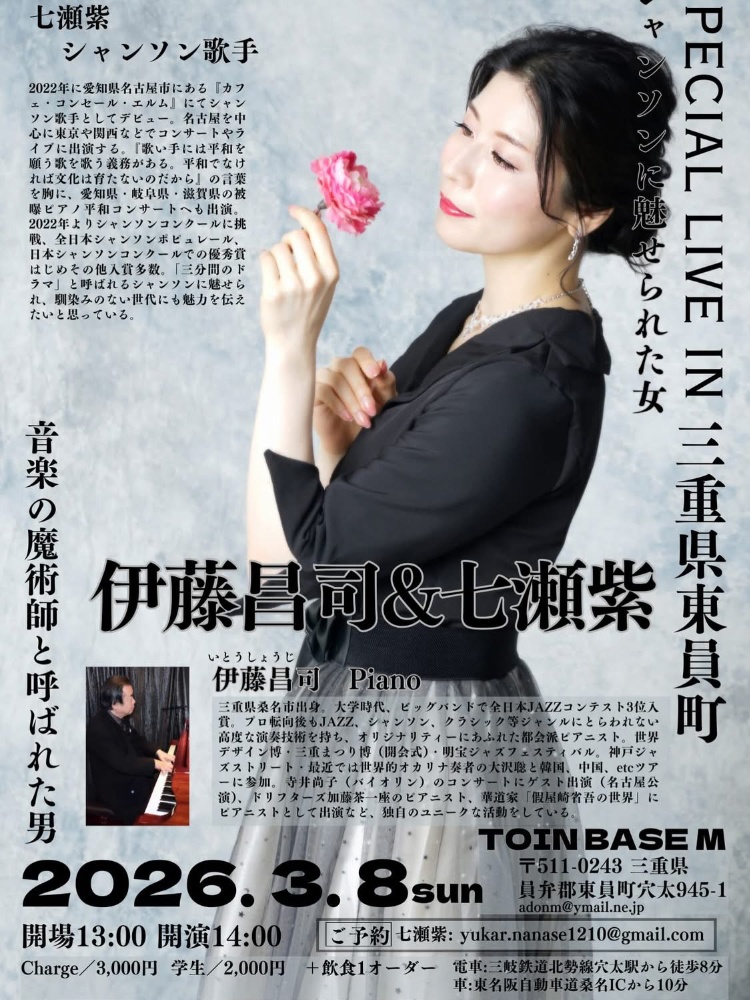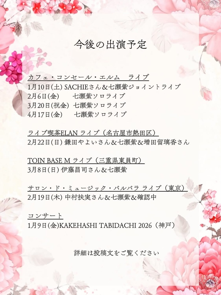 イベントサークル若鯱会はシャンソン歌手の「七瀬紫(ゆかり)」さんを応援しています。カフェ・コンセール・エルム(有)吹上文化サロン「エルムシスターズ」所属 ❤️